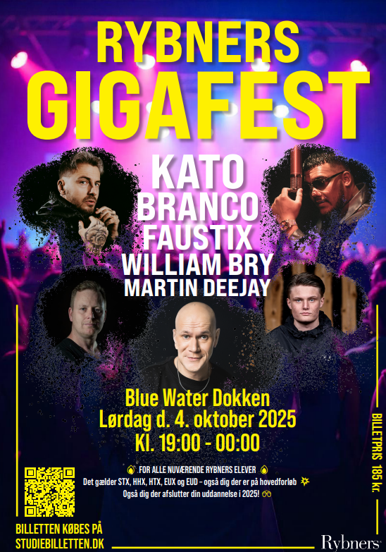 Med ønsket om at skabe en ny, samlende og årligt tilbagevendende tradition har Rybners netop lanceret Rybners GIGAFEST – en fest for alle nuværende elever på skolens gymnasiale og erhvervsrettede uddannelser: STX, HHX, HTX, EUX og EUD – herunder også elever på hovedforløb.